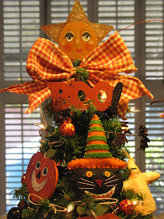 Hi Everyone. Hope you are all having a great week. Well, it’s time!! Halloween will be here before we know it. So, to get us in the mood, I’m offering the first giveaway on my blog. I’m giving away one of my Happy Halloween trees. The 18 inch tree sits in a hand painted 5 inch metal pail. On the front I painted a cute Halloween scene. This is a Maxine Thomas design. On the tree is a string of 50 clear lights, berry picks, hand painted Jack O’ Lantern pumpkins, cats, bats, a witch face, and witch hats. Also on the tree is a resin ghost, pumpkin head, witch, and a cat face. There are also tiny little witch brooms. At the top of the tree is a large rusty star. The entire tree measures 23 inch tall.